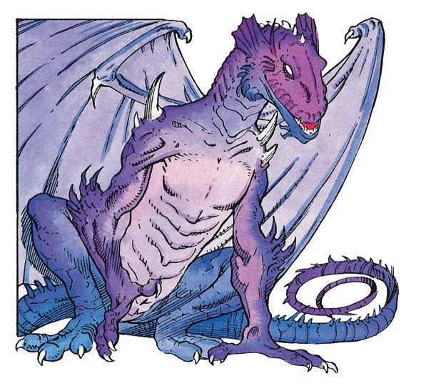 Amethyst dragons are wise and regal, with a detached air, and ignore what they consider to be petty squabbles between good and evil, law and chaos. When hatched, amethyst dragons have lavender skin with small scales of a light, translucent purple. As they grow older, the scales gradually darken. Adults are a sparkling lavender in color.