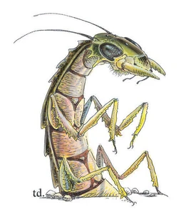 The ankheg resembles an enormous many-legged worm. Its six legs end in sharp hooks suitable for burrowing and grasping, and its powerful mandibles are capable of snapping a small tree in half with a single bite. A tough chitinous shell, usually brown or yellow, covers its entire body except for its soft pink belly. The ankheg has glistening black eyes, a small mouth lined with tiny rows of chitinous teeth, and two sensitive antennae that can detect movement of man-sized creatures up to 300 feet away.