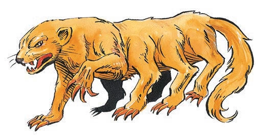 Despite being only the size of a large badger, the aurumvorax, or "golden gorger," is an incredibly dangerous creature. The animal is covered with coarse golden hair and has small silver eyes with golden pupils. It has eight powerful legs that end in 3-inch-long copper claws. The aurumvorax's shoulders are massively muscled while its heavy jaw is full of coppery teeth.